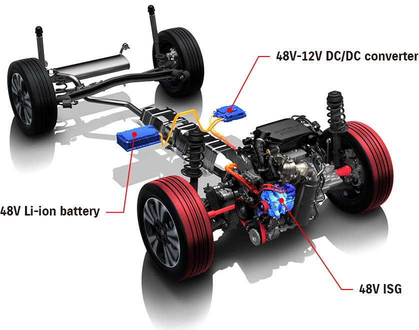The 48V SHVS mild hybrid system consists of the 1.4 BOOSTERJET engine, a 48V ISG (Integrated Starter Generator) with electric motor function, 48V Lithium-ion battery and 48-12V DC/DC converter. With a greater supply voltage than conventional 12V, it increases both regenerated energy from deceleration and the amount of electric motor assist to suppress fuel consumption and enhance driving performance.