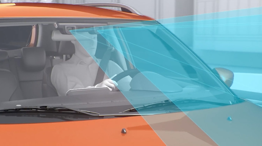 Two cameras recognise forward vehicles, pedestrians, and lane lines just like human eyes. Based on various information captured by these cameras, this system helps avoid collisions and mitigate collision damage through warnings and automatic braking.