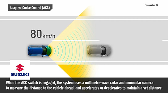 ACC helps reduce driver fatigue on long trips and when driving in traffic, and is linked to the Traffic Sign Recognition system to help drivers comply with posted speed limits. When the ACC switch on the steering wheel is engaged in traffic, the system uses millimetre-wave radar and a monocular camera to measure the distance to the vehicle ahead, and will accelerate or decelerate as needed to maintain a set distance. If the road ahead is clear, it will maintain the speed the vehicle was traveling when the switch was engaged. (On CVT-equipped models, ACC disengages when the vehicle comes to a stop. On MT-equipped models, ACC disengages at speeds of approximately 30 km/h or less.)