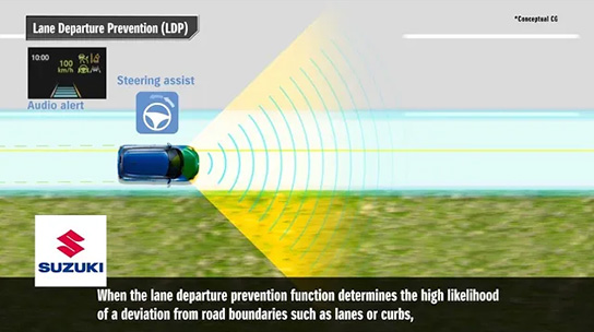 When driving, LDP detects the left and right lane demarcation lines and predicts the vehicle’s path. If the vehicle begins to drift from the lane due to driver inattention, the system alerts the driver by sounding an audio alert or vibrating the steering wheel. If the system determines there is still a high probability of lane departure, it provides steering assistance to help the driver return to the centre of the lane.