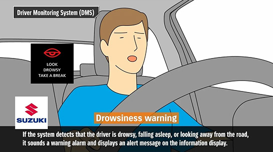A camera installed next to the display monitors driver’s face and reads eye opening/closing, gaze and face direction. If the system detects driver's dozing off, drowsiness, and distraction by using the facial information, it sounds a warning alarm and displays an alert message on the information display.