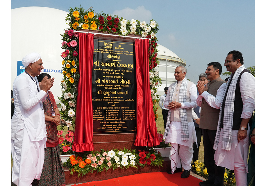The opening ceremony of BANAS SUZUKI BIOGAS PLANT held on 18 January was attended by Mr. Acharya Devvrat, Governor of Gujarat, Mr. Shankar Chaudhary, Chairman of Banas Dairy and Speaker of Gujarat Legislative Assembly, and Kenichiro Toyofuku, Managing Officer, Executive General Manager, Biogas Operations of Suzuki.