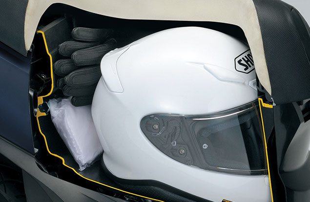 Stash your full-face helmet*, rain gear and other items in the roomy 20.6 liter utility compartment, generously designed for extra spaciousness and convenience.