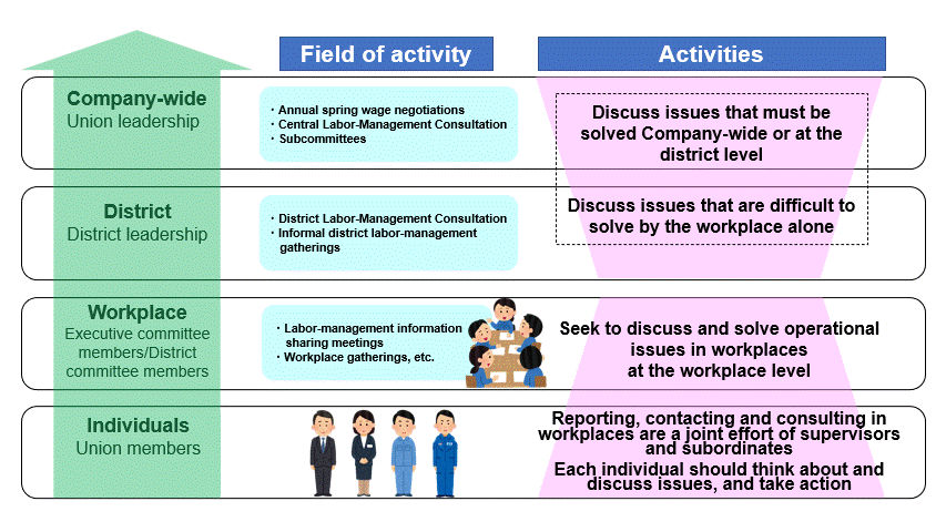 Communication is enhanced by holding regular informal labor-management gatherings at the division level to make them address issues of their own workplace by themselves first. Issues that are difficult to solve by the workplace alone are discussed continuously in District Labor-Management Consultation and Central Labor-Management Consultation meetings held monthly until the Shunto labor-management wage negotiations in March. This process aims to make the annual spring wage negotiations the capstone of labor-management discussions.
