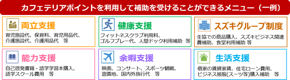To ensure benefits are received fairly by employees regardless of worksite or environment and to broadly support the preferences of individual employees in their diversity, employees can freely select from a benefits menu set up by the Company (work-life balance support, health support, skill level support, leisure time support, and lifestyle support, etc.) and can receive this assistance up to the number of points that have been received (cafeteria points).
