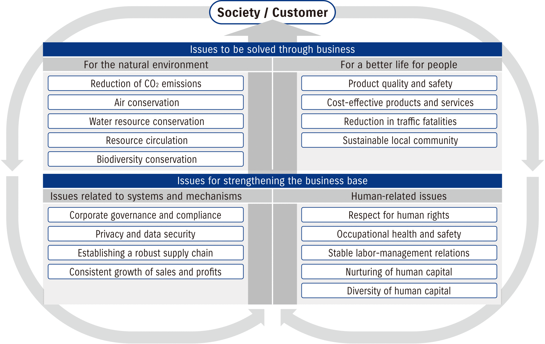 In identifying our materiality, we remained mindful of “focusing on the customer” as stated in our Mission Statement and considered how to contribute to society and customers by solving issues, dividing the issues broadly into two groups: issues to be solved through business and issues for strengthening the business base. We will promote our future initiatives by using the newly identified and organized materiality as the basis of Suzuki’s sustainability policy. Following the formulation of the Mid-Term Management Plan, announced in February 2025, we performed a review of our current materiality (key issues) by giving consideration to changes in the environment surrounding our business.