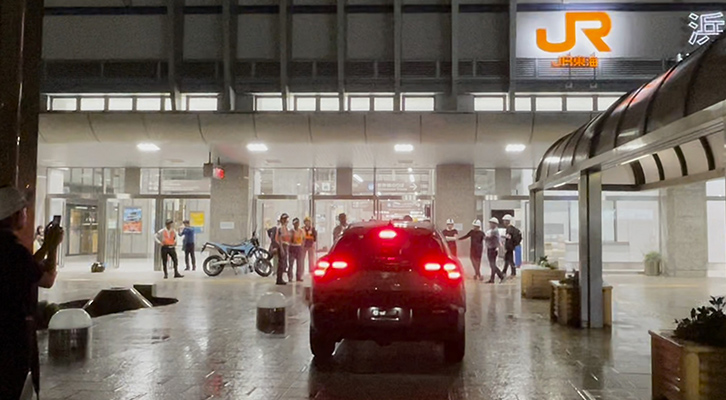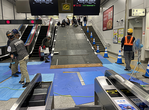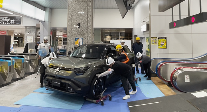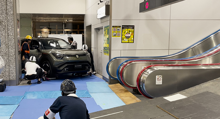 At around 11:30 p.m. on July 10 the team gathered, waiting for the final train to clear the tracks to make sure work inside the station could proceed safely. Shortly after midnight as the day changed to July 11, trucks carrying the vehicles arrived and were unloaded. Calling out to each other to coordinate each step to ensure the utmost safety, the team worked together to first bring the vehicles into the station. Then they proceeded to the local-line ticket gate, avoiding the too-narrow bullet train gates. At tight corners where steering was not possible, the team used jacks to lift the tyres and adjust their orientation, a clever workaround that allowed a pivot through turns.